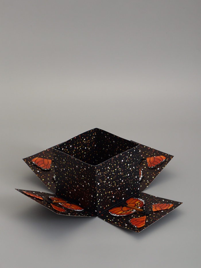 - Вау-эффект при открытии: Внутри коробки скрыт механизм с бабочками, которые заранее закручиваются. При снятии крышки они расправляются и «взлетают», создавая динамичный и неожиданный эффект, который дарит эмоции с первых секунд.