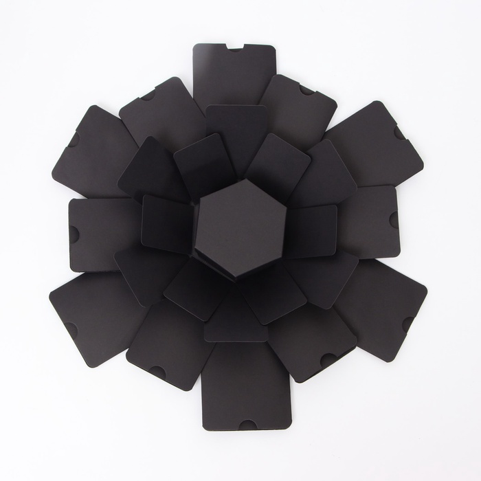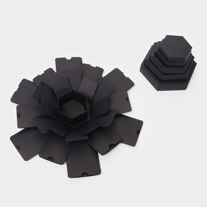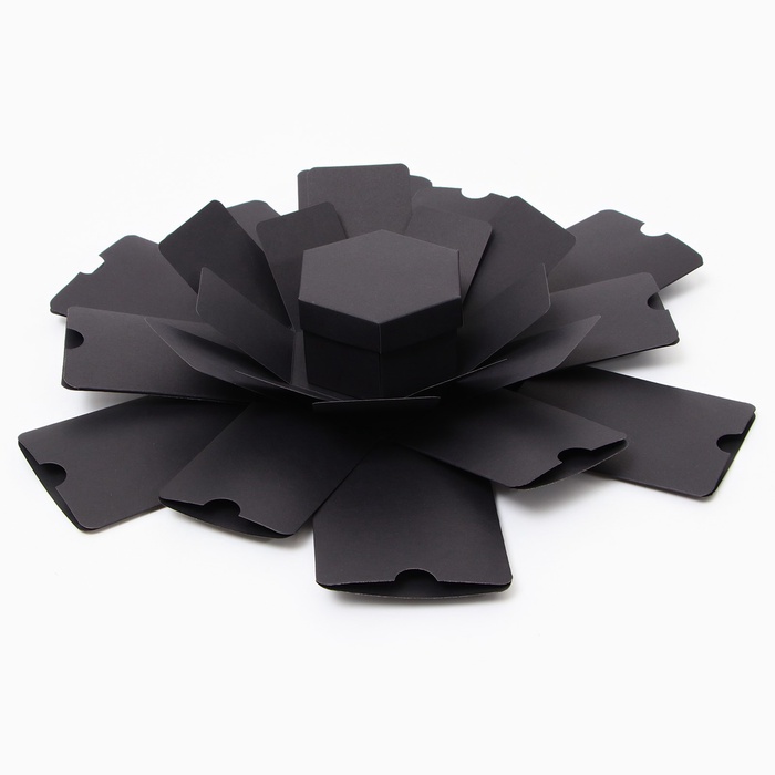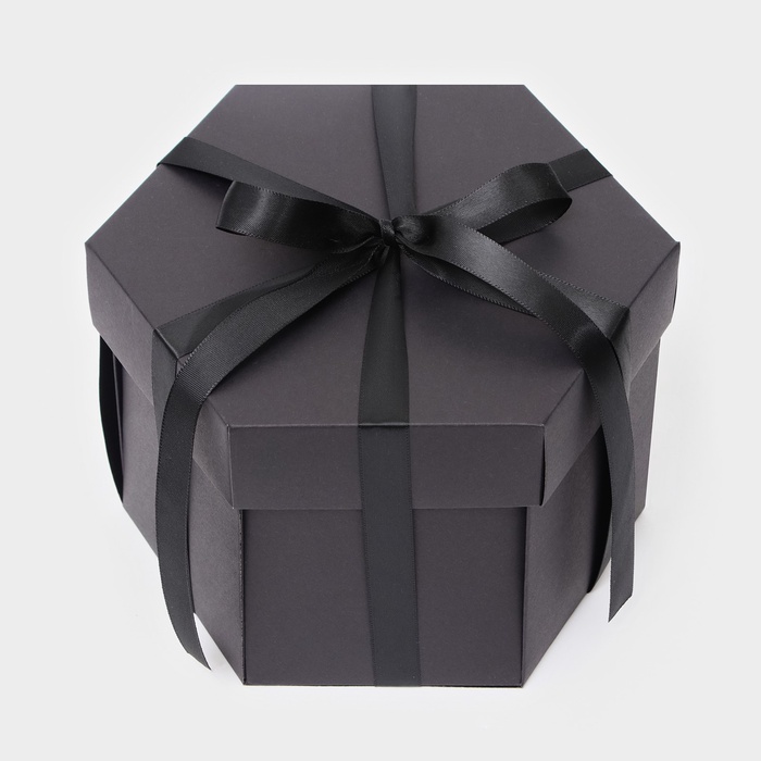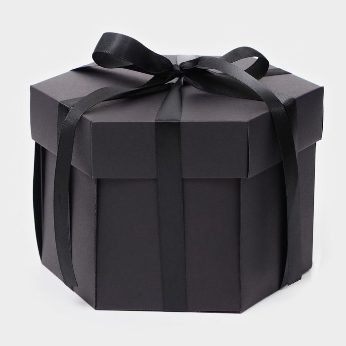 Драматичное раскрытие для стильного подарка! Чёрная коробка-раскладушка с контрастной лентой — это интерактивная упаковка, создающая атмосферу таинственности и элегантности. Момент раскрытия шестиугольных створок превращает вручение подарка в запоминающееся событие.