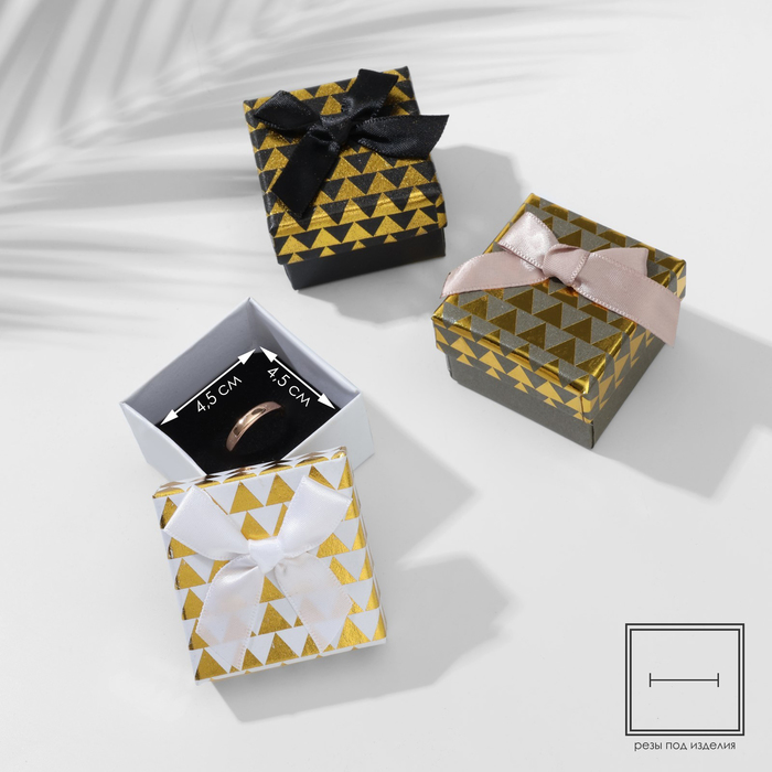 С нашими прекрасными коробочками любой подарок станет еще лучше и ярче. Футляр выполнен из прочного плотного картона. Оптимальный размер коробки 5*5см позволяет разместить кольцо. Внутри каждой коробочки с крышкой есть чёрная бархатная подложка. С помощью специальных прорезей на подушечке можно аккуратно разместить и зафиксировать украшение. А если убрать подложку, упаковка подойдет даже для часов с мягким плоским ремешком или на цепи.