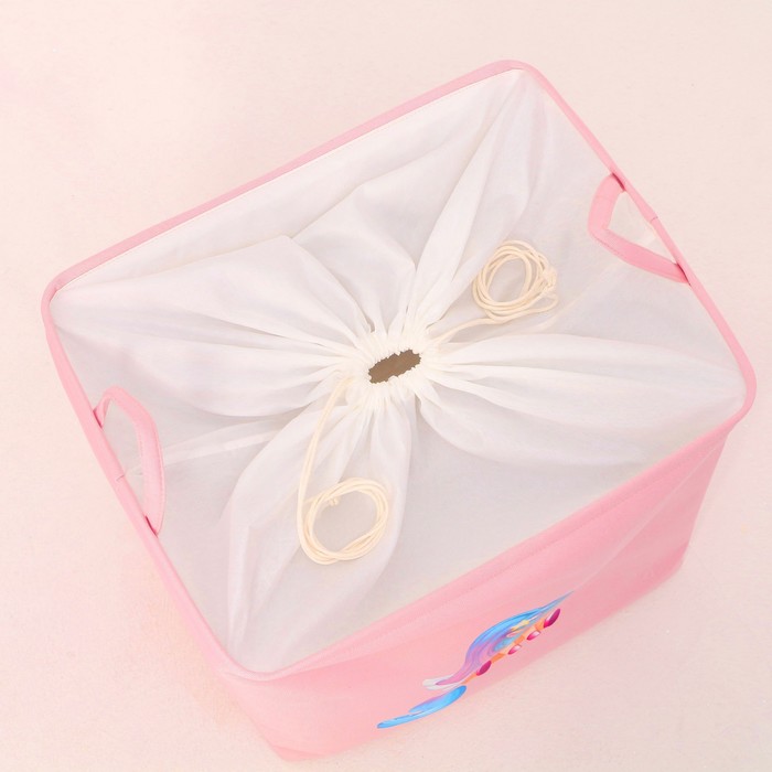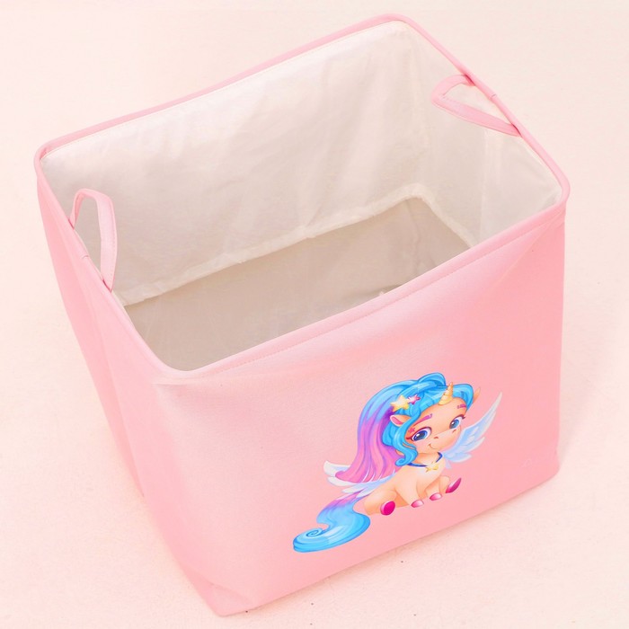 Эта корзина — не просто место для хранения, а элемент декора. Цветовая гамма сочетается с любым интерьером, а изображение единорога добавляет яркий акцент. Её можно использовать не только в детской комнате, но и в игровой зоне или даже в автомобиле, чтобы игрушки всегда были под рукой.