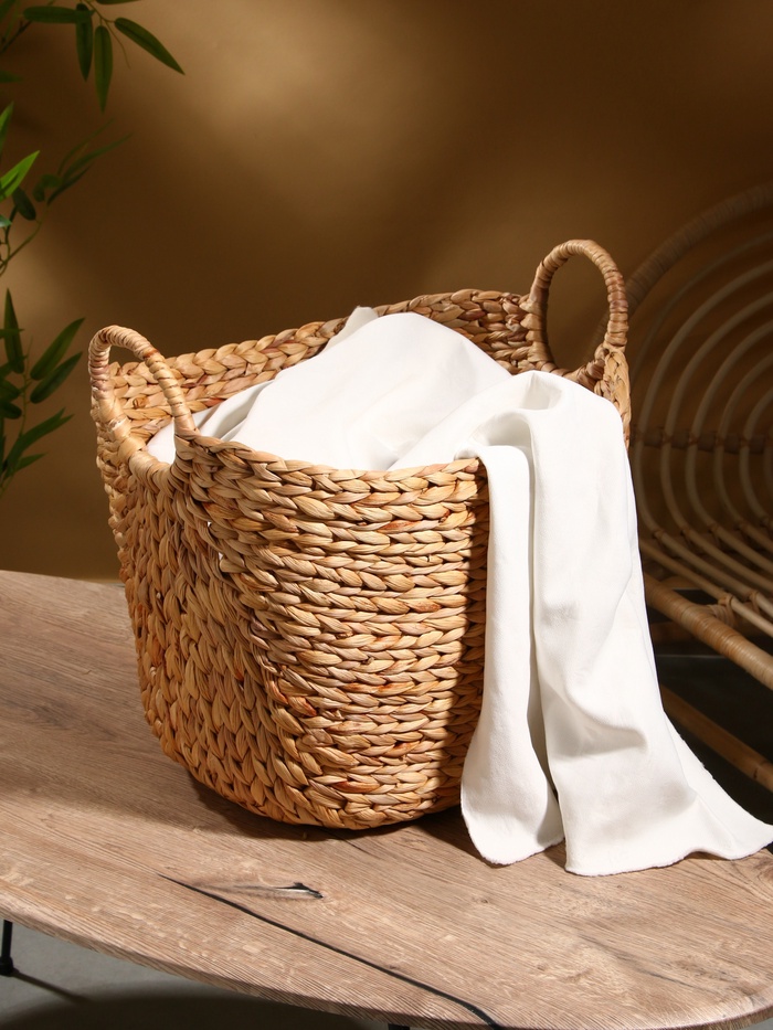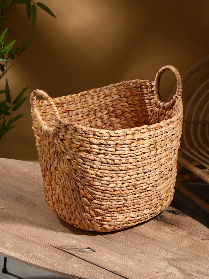 Плетёная корзина из водного гиацинта — натуральное решение для хранения и декора. Овальная форма и бежевый оттенок органично вписываются в современные интерьеры, а прочная конструкция выдерживает ежедневное использование.