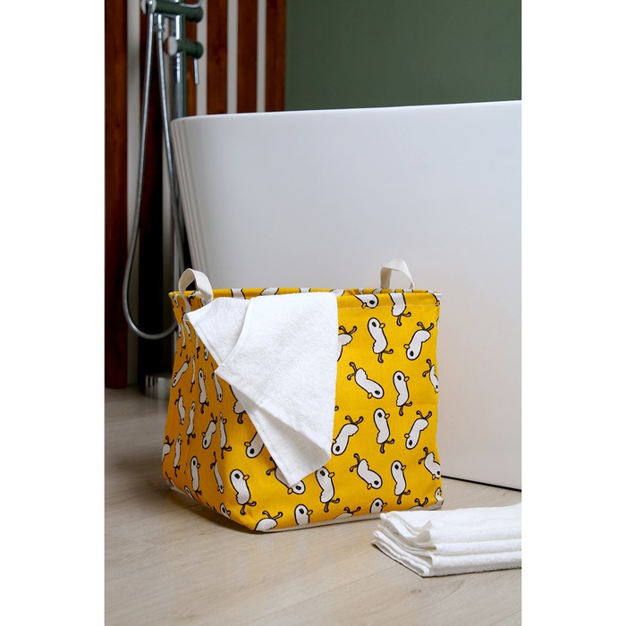 Эта корзина — не просто место для хранения, а элемент декора. Жёлто-белая цветовая гамма сочетается с любым интерьером, а изображения транспорта добавляют яркий акцент. Её можно использовать не только в детской комнате, но и в игровой зоне или даже в автомобиле, чтобы игрушки всегда были под рукой.