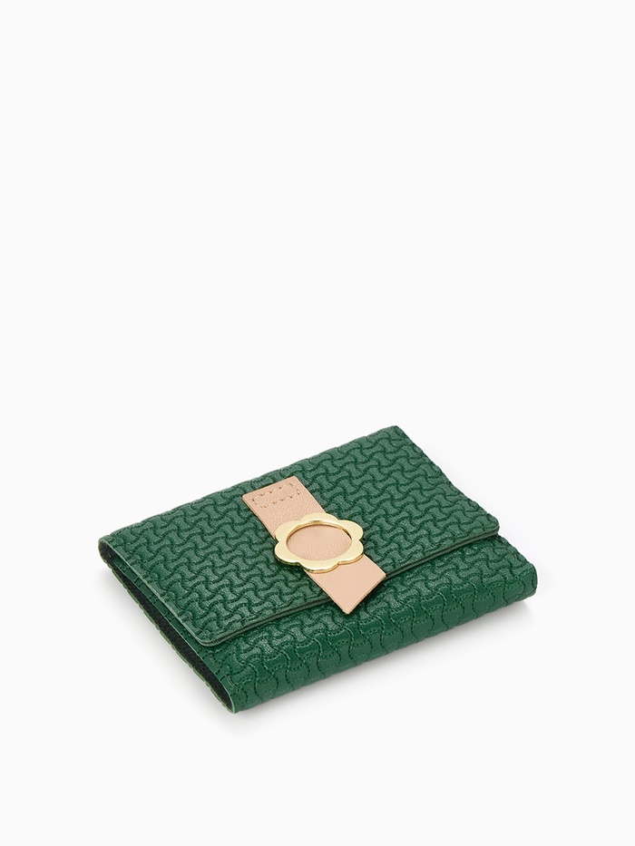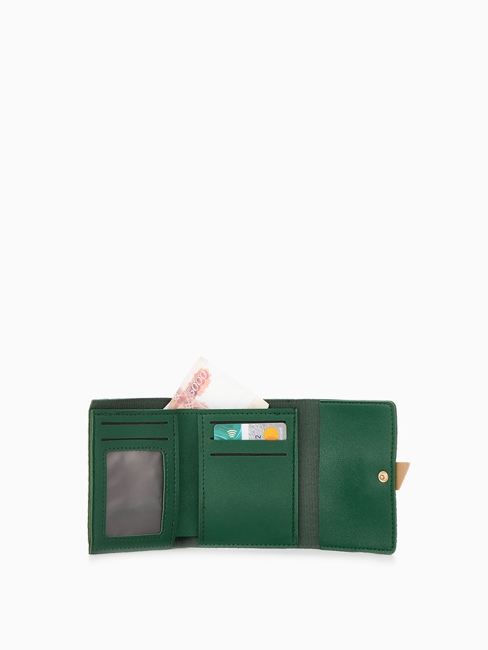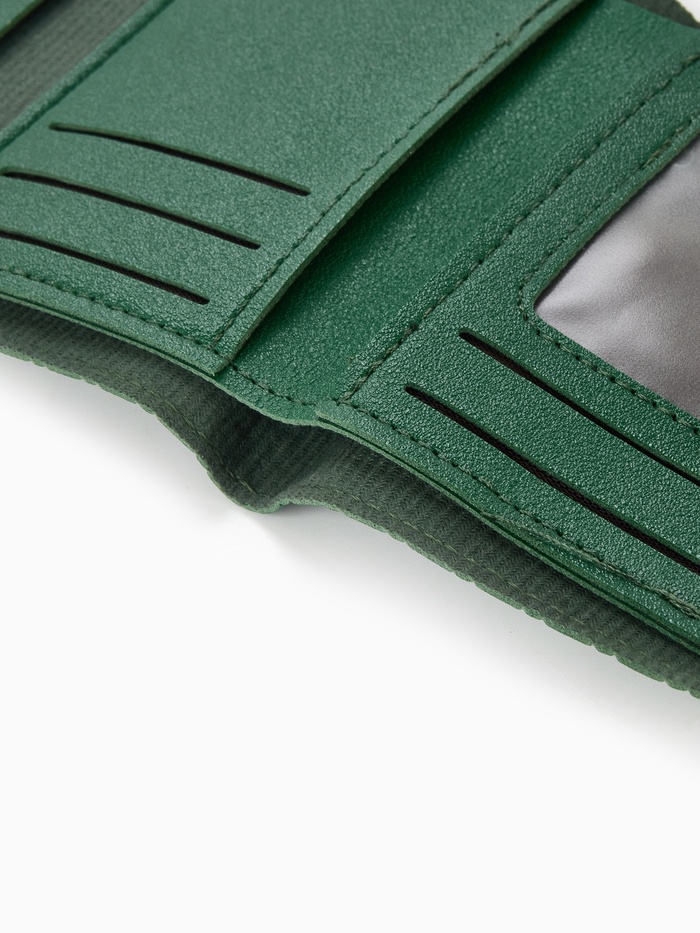 Зелёный кошелёк на кнопке — лаконичный аксессуар для повседневного стиля. Его удобный средний формат и тройное сложение создают практичный объём, сохраняя элегантную плоскую форму. Комбинированная фактура искусственной кожи добавляет характер, делая кошелёк заметной деталью образа.