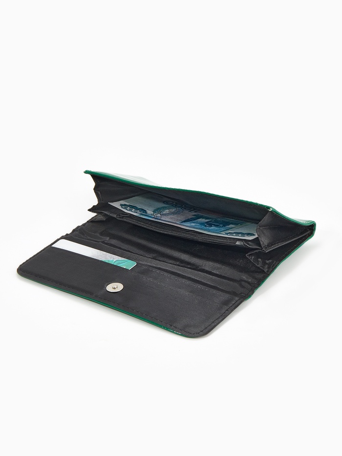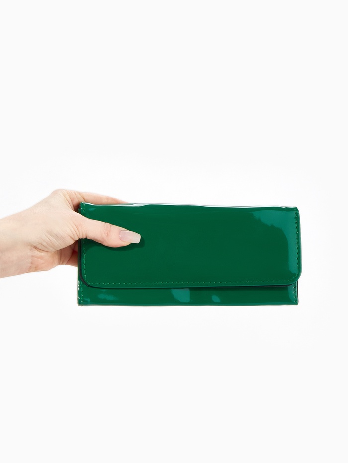 Зеленый лаковый кошелек создает свежий акцент в повседневном образе. Магнитная застежка и продуманная организация делают использование интуитивно понятным.