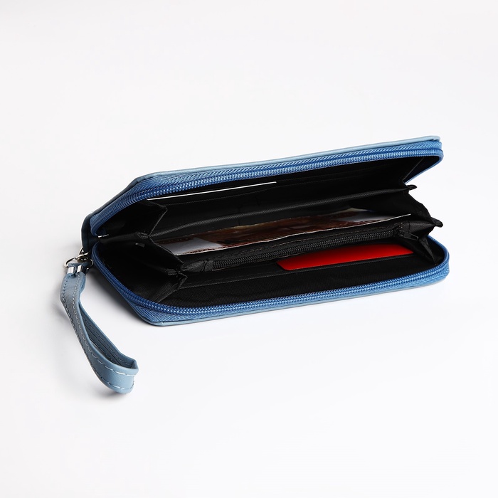 Этот женский кошелёк на молнии с ремешком создаёт ощущение лёгкости и порядка. Нежный голубой цвет привносит в классический дизайн свежесть, сохраняя его практичность и функциональность.
