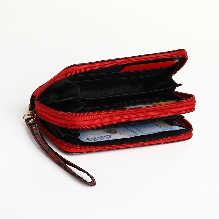 Этот женский кошелёк с ремешком создан для тех, кто ценит выразительные детали и практичность. Его насыщенный красный цвет и уникальный абстрактный принт делают аксессуар ярким акцентом вашего образа. Вы оцените удобство ношения на руке и продуманную организацию внутреннего пространства.