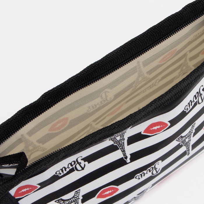 Этот стильный косметический органайзер с принтом подчеркивает вашу любовь к современной эстетике. Контрастный черно-белый дизайн с графическим изображением говорит о чувстве стиля и практичности. Он создан для тех, кто ценит порядок и лаконичность в деталях своего образа.