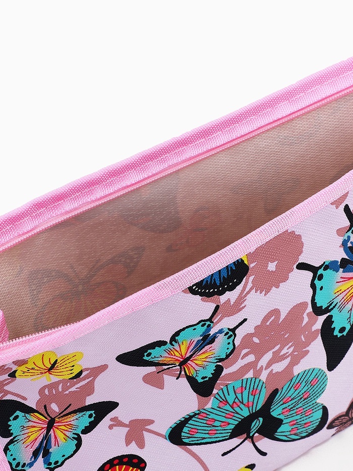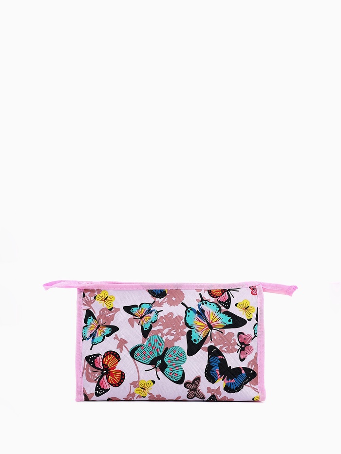 Большая косметичка «Яркие бабочки» в нежном розовом оттенке — стильный аксессуар для хранения уходовых средств и мелочей. Просторное отделение на молнии удобно для кистей и косметических продуктов. Косметичка изготовлена из искусственной кожи, поэтому она лёгкая и прочная.