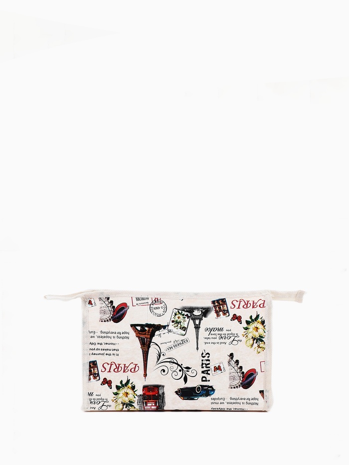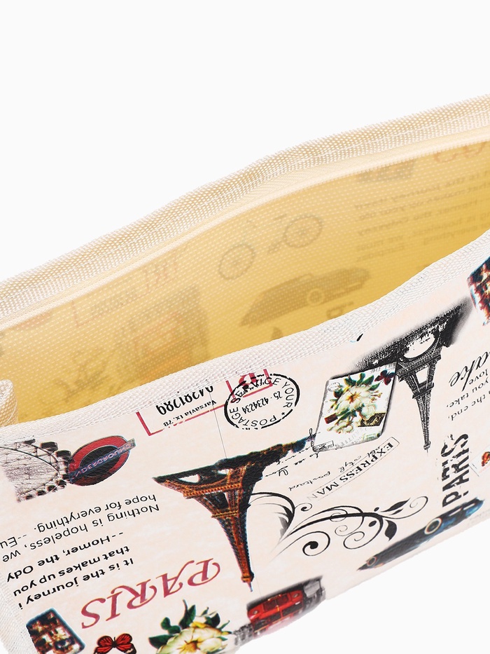Элегантная косметичка в парижском стиле — практичный аксессуар для хранения косметики и мелочей. Бежевая косметичка с романтичным принтом «Парижское настроение» добавляет образу французский шарм. Средний размер оптимален для ежедневного использования, а надёжная молния обеспечивает сохранность содержимого.
