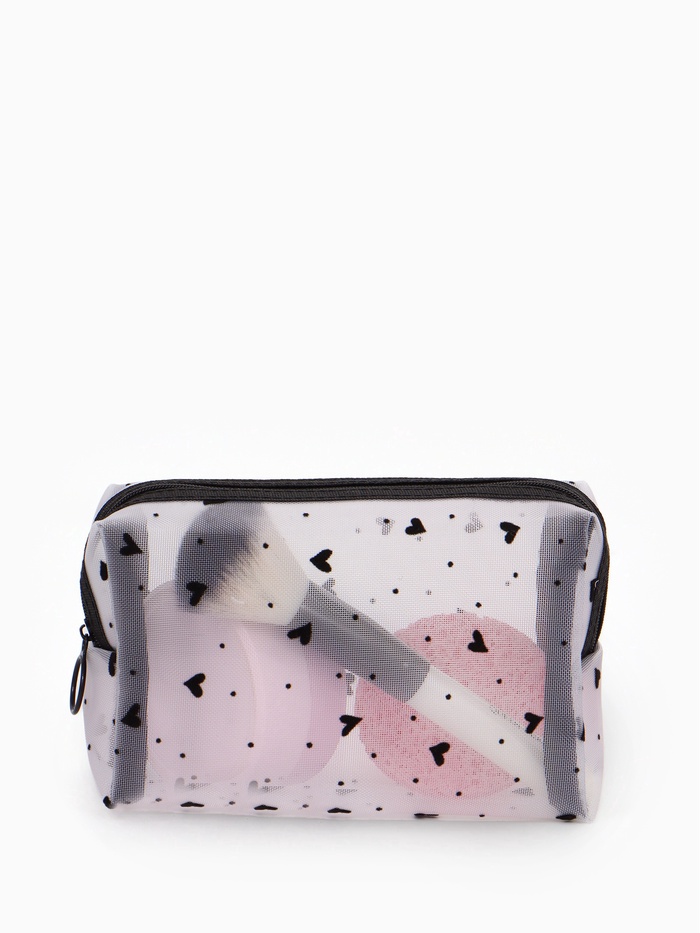 Эта изящная косметичка станет вашим верным спутником в мире красоты. Ее белый оттенок идеально сочетается с узором в виде сердец, создавая эффект нежности и романтики. Длина в 18 см и высота в 10 см делают ее практичным и компактным аксессуаром, который поместится даже в небольшой сумке или рюкзаке, подходящий как для дам, так и для юных модниц.