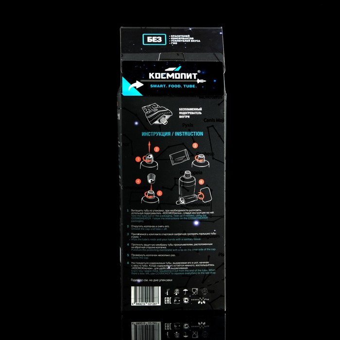 Сытные и вкусные блюда в проверенной тяжёлыми условиями космоса упаковке станут отличной альтернативой сухпайку во время выхода на природу, на охоте или рыбалке. Недостаток места, отсутствие костра и даже экстремальная погода больше не помешают обеду. Вам нужно будет просто разогреть тюбик на портативном нагревателе из комплекта и насладиться вкусной пищей.