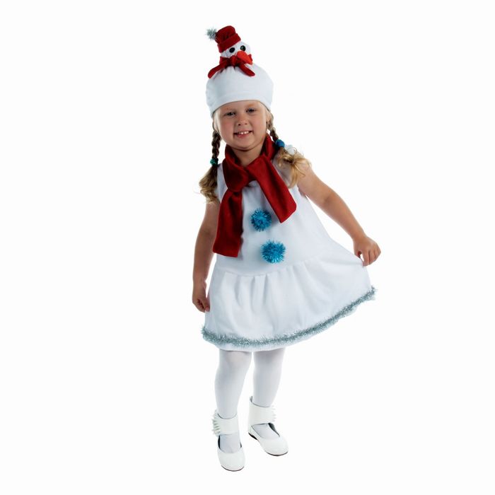 Костюм карнавальный детский «Снеговик с красным шарфом», велюр, рост 68-98 см, белый станет подходящим нарядом для девочки в новогодние праздники. Невероятно мягкое на ощупь платье без рукавов состоит из хлопка (80 %) и полиэстера (20 %), украшено блестящими бомбошками и серебристой мишурой по низу. Яркий шарф повязывается на шею. А позитивная шапка со снеговиком и носом-морковкой завершает образ.