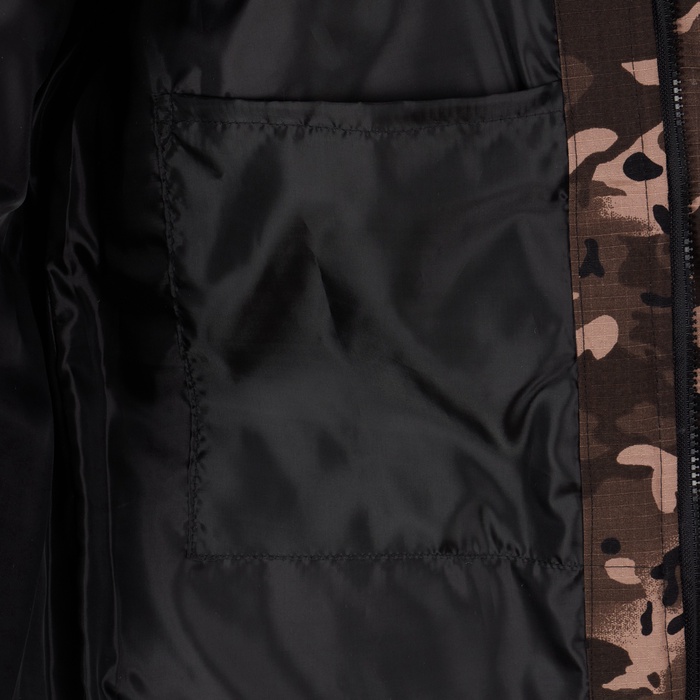 Воротник и капюшон утеплены флисом, манжеты рукавов собраны на резинку, удлинённая куртка застёгивается на молнию с ветрозащитным клапаном. Костюм имеет пять карманов: три — на куртке, два — на полукомбинезоне. Лямки можно регулировать по длине.