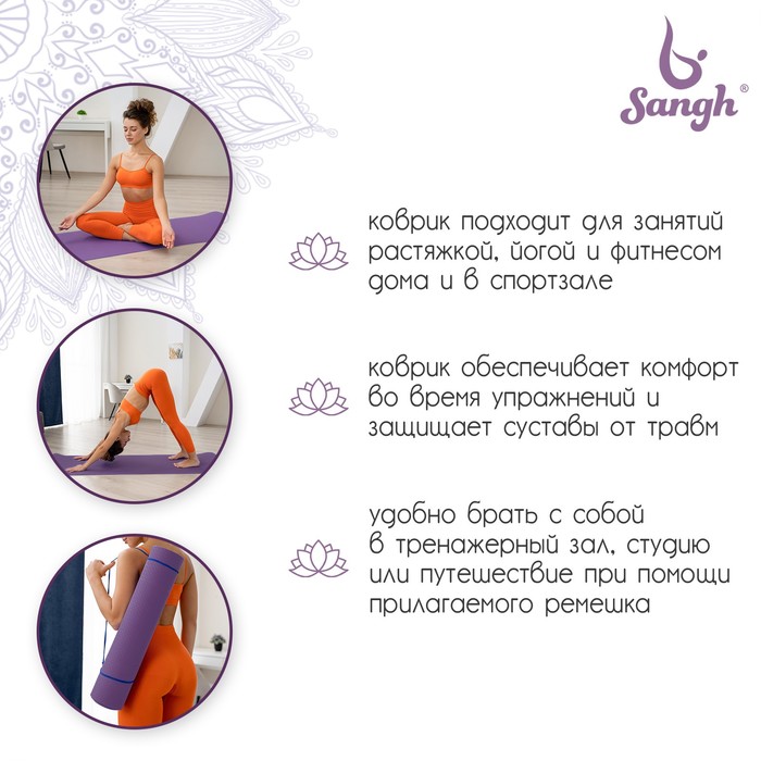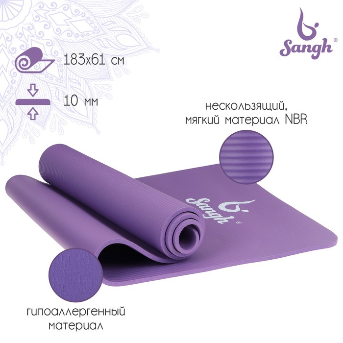 Коврик для йоги Sangh, нескользящий, 183×61×0.6 см, цвет фиолетовый