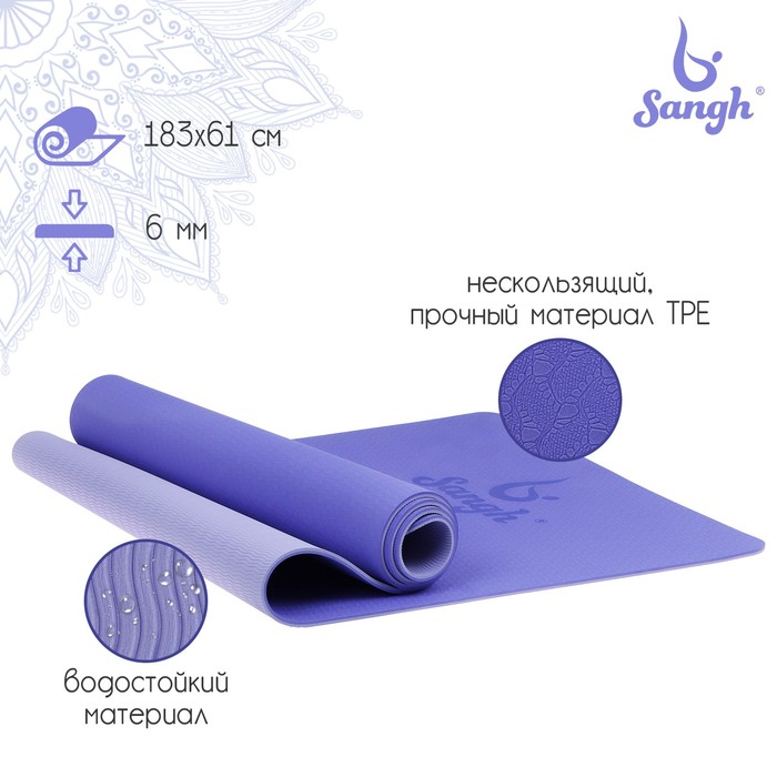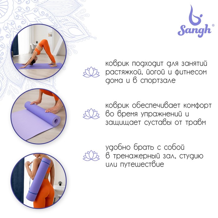 Коврик для йоги Sangh, нескользящий, 183×61×0.6 см, цвет сиреневый