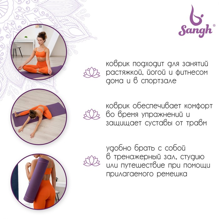 Коврик подходит для занятий йогой и фитнесом дома и в спортивных залах. Помогает в выполнении асан или других упражнений. Смягчает упор тела на твёрдую поверхность. Сохраняет форму после выполнения упражнений.