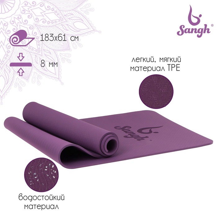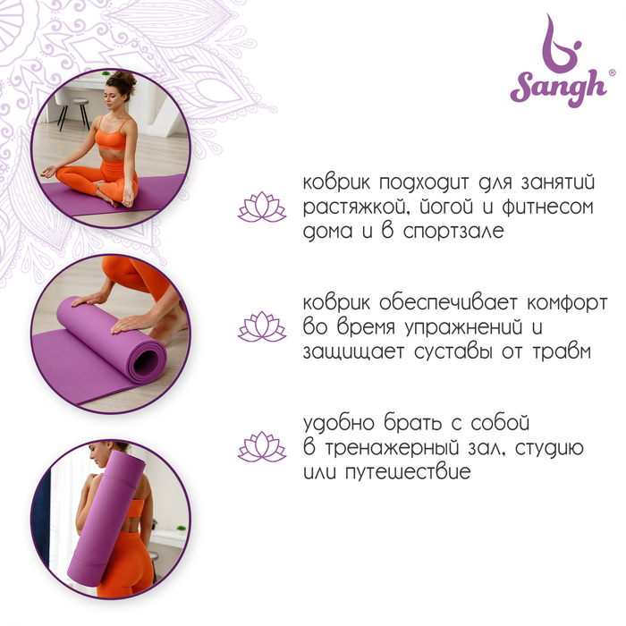 Коврик подходит для занятий йогой и фитнесом дома и в спортивных залах. Помогает в выполнении асан или других упражнений. Смягчает упор тела на твёрдую поверхность. Сохраняет форму после выполнения упражнений.