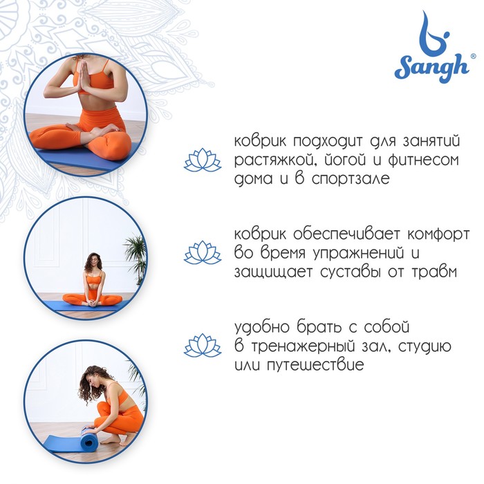 Коврик подходит для занятий йогой и фитнесом дома и в спортивных залах. Помогает в выполнении асан или других упражнений. Смягчает упор тела на твёрдую поверхность. Сохраняет форму после выполнения упражнений.