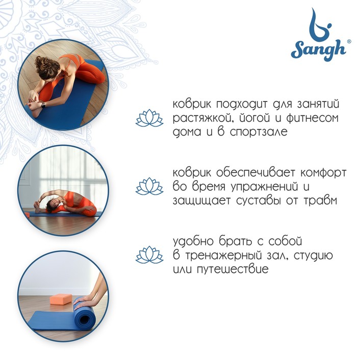 Коврик подходит для занятий йогой и фитнесом дома и в спортивных залах. Помогает в выполнении асан или других упражнений. Смягчает упор тела на твёрдую поверхность. Сохраняет форму после выполнения упражнений.