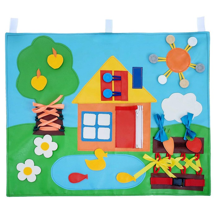 Коврик можно повесить за лямки либо играть за столом или на полу. Изделие выполнено из винилискожы. Материал легко очищается от загрязнений, достаточно лишь протереть нужное место влажной губкой, смоченной в мыльном растворе.