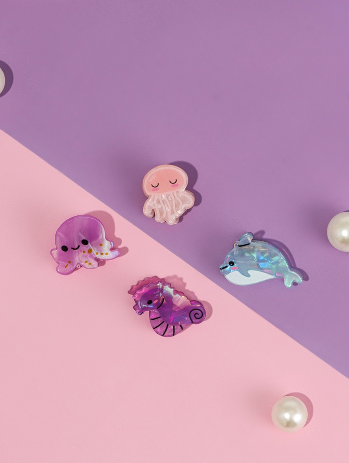 - Четверка веселых крабиков: В наборе — четыре разноцветные заколки с добрыми мордашками. Каждый крабик уникален, что позволяет менять аксессуар под настроение или наряд. Ребенку будет интересно собирать коллекцию и выбирать героя для новой прически.