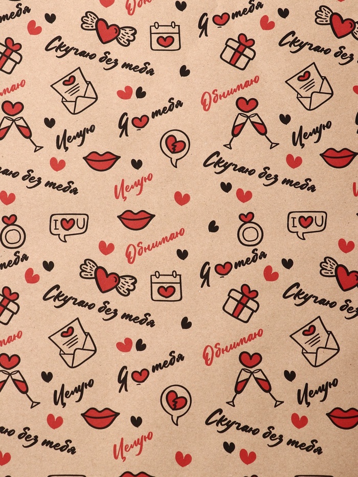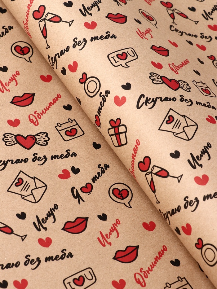 Крафт бумага "Я люблю тебя" черный/красный цв. на коричневом фоне 0,68 х 10 ±5% м, 60 гр