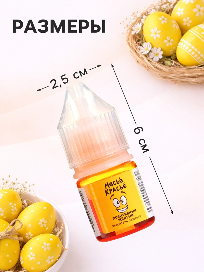 Простота в каждом флаконе: Водорастворимая формула не требует специальных навыков. Добавляйте средство в воду для варки или смешивайте с кремом для десертов. Сохраняйте натуральный вкус продуктов — краситель не имеет запаха и привкуса. «Позитивный жёлтый» — это способ сделать пасхальный стол тёплым и радостным. Добавьте солнца в традиционные блюда в несколько капель!