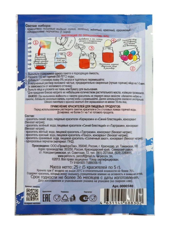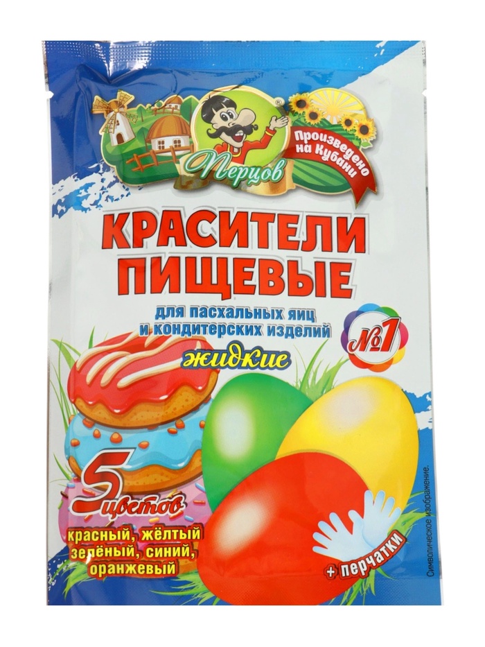 - Готовая палитра из 5 цветов: В набор входят основные яркие оттенки, необходимые для создания традиционных пасхальных яиц. Цвета насыщенные, хорошо прокрашивают скорлупу без разводов и полос. Жидкая форма обеспечивает равномерное распределение красителя.