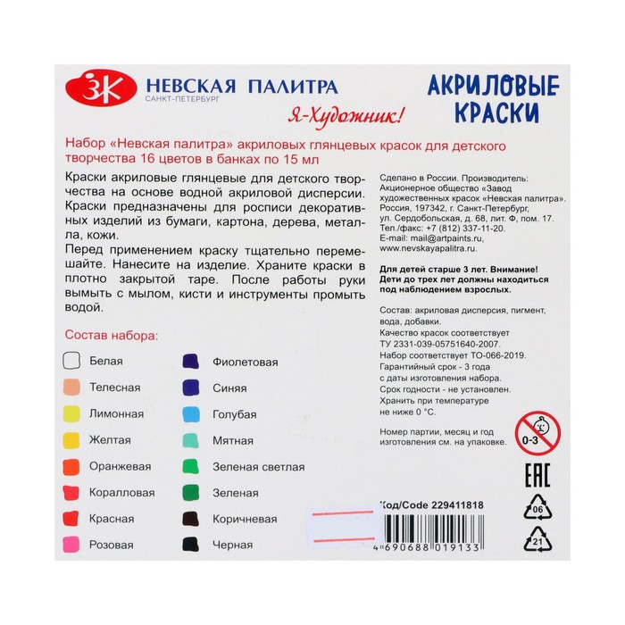 Краски для детского творчества "Я-Художник!" на основе водной акриловой дисперсии предназначены для росписи декоративных изделий из бумаги, картона, дерева, металла, кожи. Краски хорошо смешиваются, быстро высыхают. После высыхания приобретают глянцевый блеск, не смываются водой.