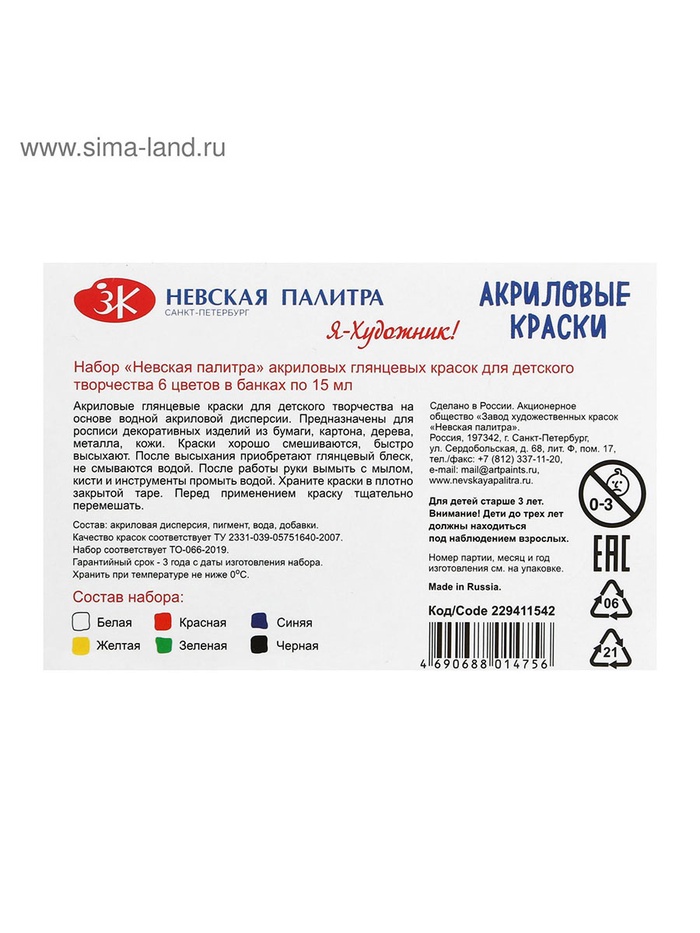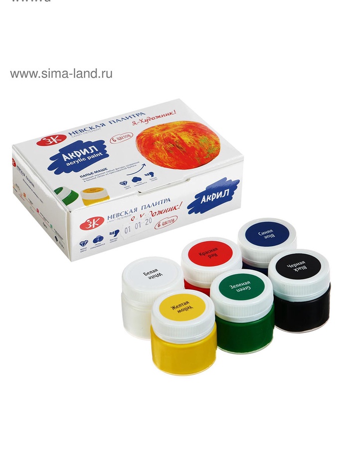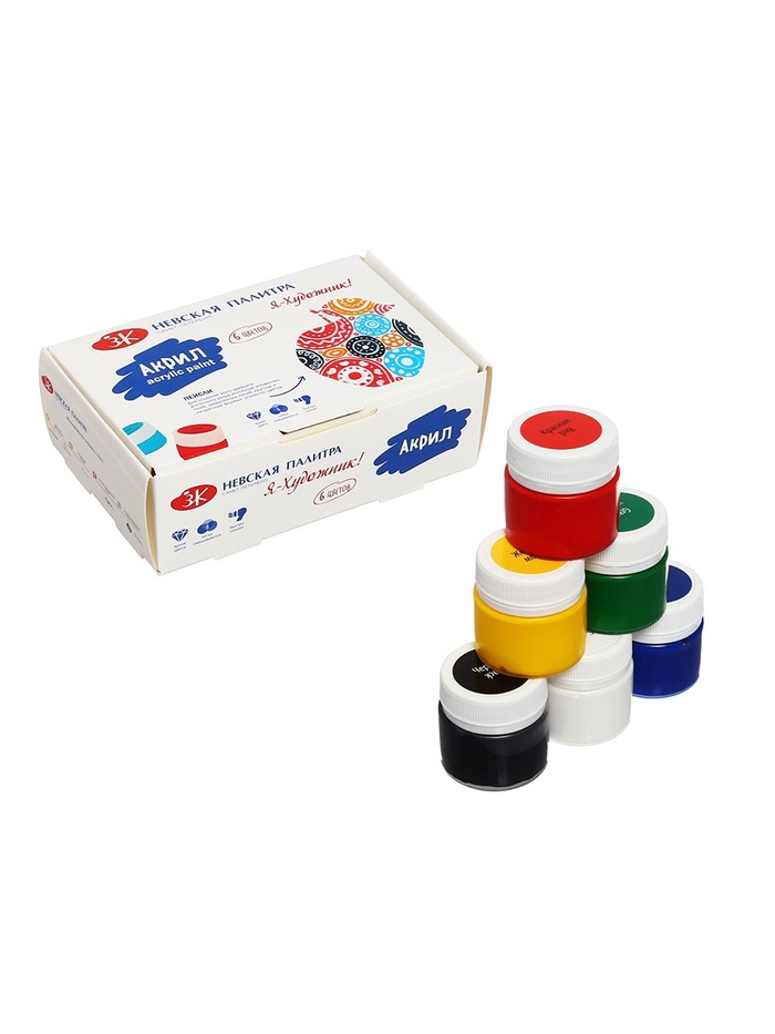 Акриловые глянцевые краски для детского творчества на основе водной акриловой дисперсии. Предназначены для росписи декоративных изделий из бумаги, картона, дерева, металла, кожи. Краски хорошо смешиваются, быстро высыхают. После высыхания приобретают глянцевый блеск, не смываются водой. После работы руки вымыть с мылом, кисти и инструменты промыть водой. Храните краски в плотно закрытой таре. Перед применением краску тщательно перемешать.