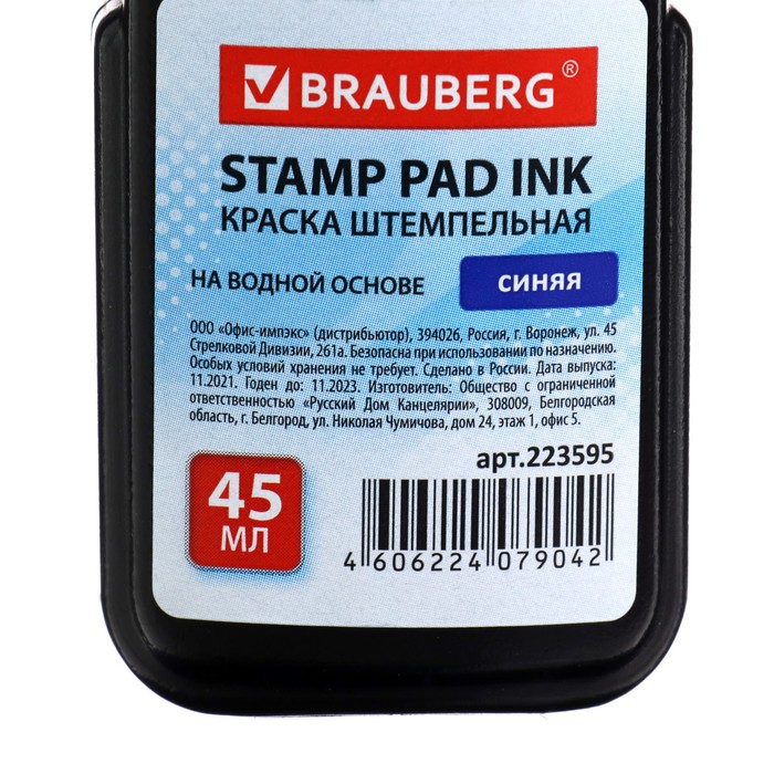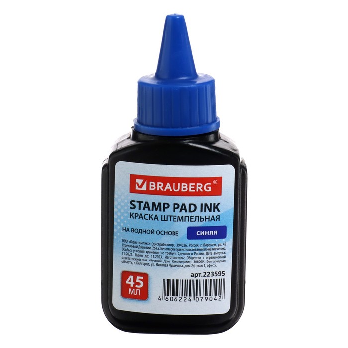 Штемпельная краска BRAUBERG предназначена для заправки штемпельных подушек, используемых для всех видов ручных и автоматических оснасток печатей, штампов, нумераторов и датеров. Оттиск штампа можно наносить на все виды бумаги, кроме глянцевой. Высококачественные чернила синего цвета на водной основе. Время высыхания оттиска - 30 секунд. Удобный пластиковый флакон с дозатором. Объем - 45 мл.