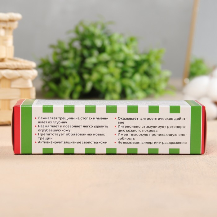Способ применения: перед сном ноги распарить в воде, пятки обработать пемзой. При наличии трещин избегать травмирования. Протереть насухо, нанести бальзам на загрубевшие участки сверху по возможности, прикрыть пластырем. Затем надеть носки. Процедуру повторять ежедневно до полного восстановления нормального кожного покрова.