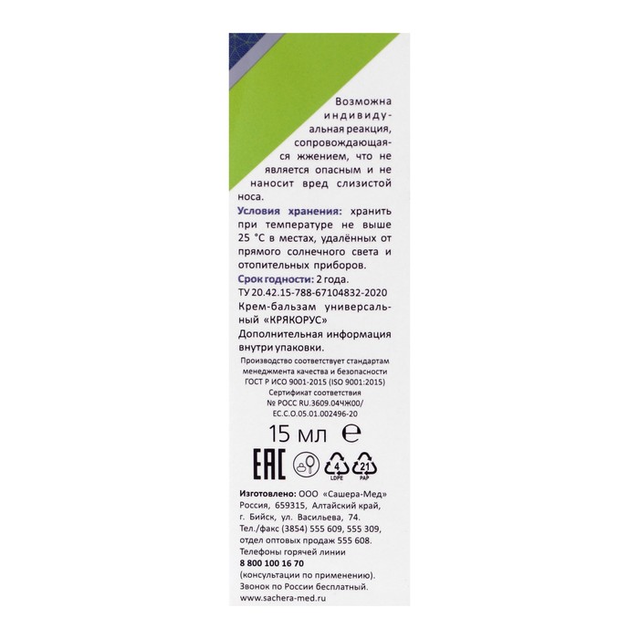 Состав: aqua, Hedysarum alpinum root extract, betula alba bark extract, Achilléa millefólium folium extract, Echinácea purpúre flower extract, Sambucus nigra fruit extract, Hippophae rhamnoides fruit/leaf system extract, Bergénia crassifólia root/leaf system extract, Syzýgium aromáticum fruit extract, Cantharēllus cibārius extract, Phallus impudicus extract, Melissa officinalis leaf extract, Potentilla alba root extract, Lespedeza juncearoot extract, Pteridium aquilinum root extract, Júglans régia oil, Geranium Macrorrhizum herb oil, Hypericum perforatum oil, Calendula Officinalis flower oil, mumio, ascorbic acid, beeswask, propolis extract, Poly (iminocarbonimidoylimino-1,6-hexanediyl), pantothenic acid, melaleuca alterni-folia leaf extract.