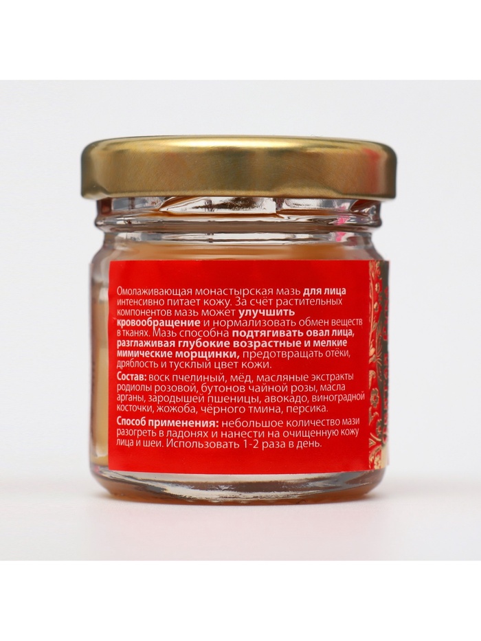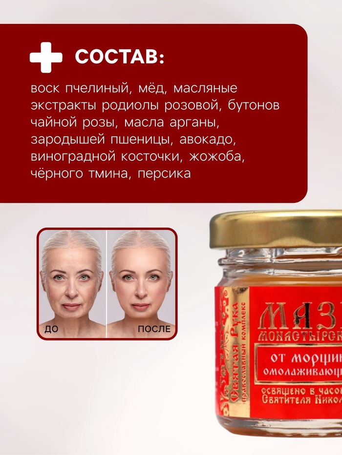 Омолаживающая монастырская мазь для лица интенсивно питает кожу. За счёт растительных компонентов мазь может улучшить кровообращение и нормализовать обмен веществ