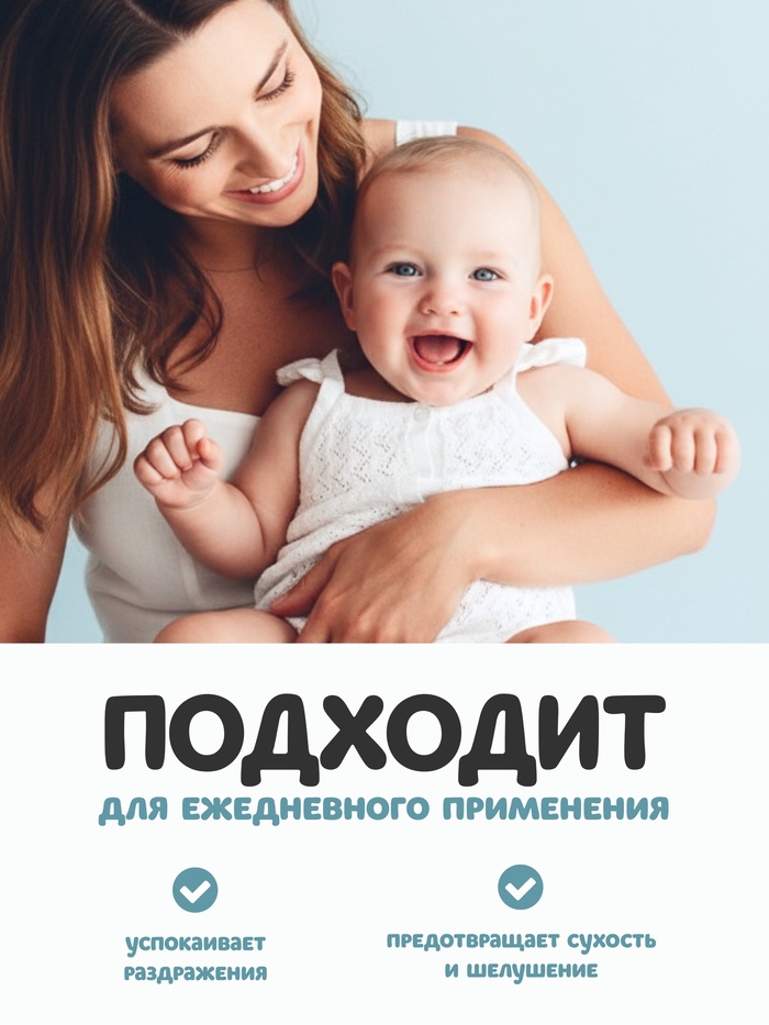 Продукт разработан специально для сухой и особо чувствительной детской кожи, с учетом возрастных особенностей и потребностей, в его составе нет силиконов, парабенов, гормонов и красителей.
