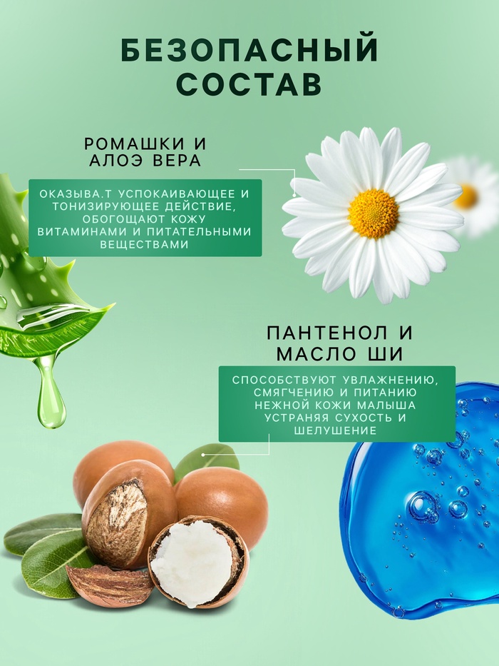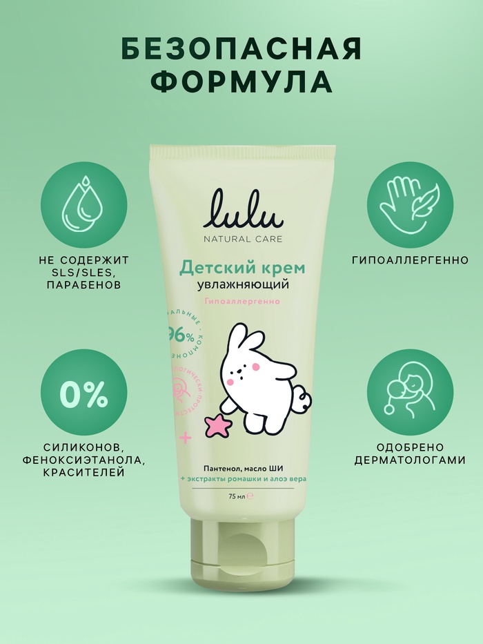 Детский увлажняющий крем разработан специально для нежной кожи малышей. Его формула на 96% состоит из натуральных компонентов, включая пантенол, масло ши, экстракты ромашки и алоэ вера.
