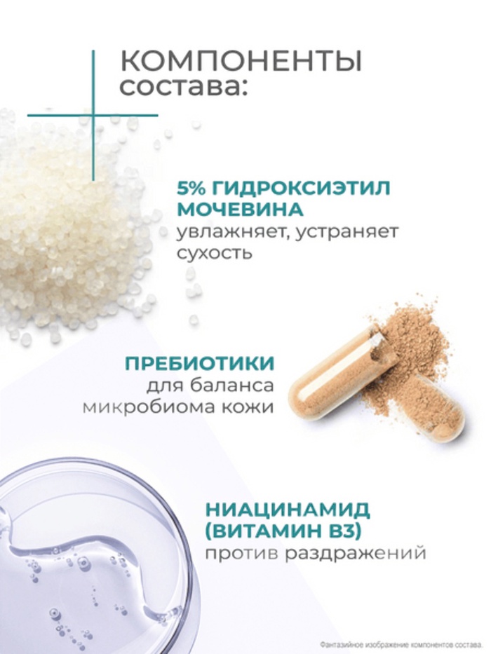 В составе содержатся мочевина 5%, пребиотики и ниацинамид (витамин В3), которые помогают поддерживать оптимальный уровень увлажнения, устранять сухость после душа и защищать кожный покров от обезвоживания.