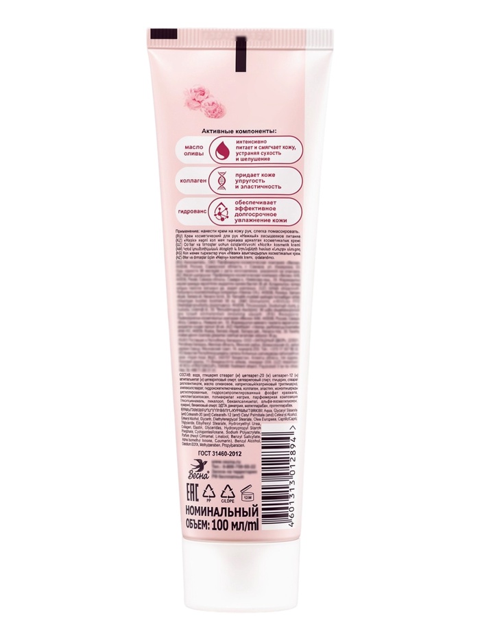 Интенсивно питающий крем для ухода за сухой и обезвоженной кожей рук. Комплекс масел оливы и авокадо глубоко питает, смягчает и устраняет сухость и шелушение. Коллаген и гидролизованный эластин придают коже упругость и эластичность, а гидрованс обеспечивает длительное увлажнение, поддерживая комфорт и мягкость кожи на протяжении всего дня. Крем делает кожу гладкой, ухоженной и шелковистой.