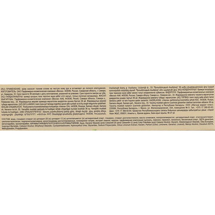 Крем для рук интенсивно увлажняет, питает, укрепляет ногти, осветляет кожу. В составе крема: натуральный глицерин, витамин С, экстракт лимона. Крем обладает приятной консистенцией и нежным ароматом, легко наносится, не оставляя ощущения липкости. Экстракт корки лимона обогощает кожу витамином С, оказывает тонизирующее действие, способствует укреплению ногтевой пластины. Натуральные компоненты увлажняющего крема обеспечивают витаминное питание кожи, оказывают антисептическое действие, обеспечивают лёгкое отбеливание кожи рук. Глицерин - один из самых эффективных натуральных увлажнителей. После нанесения лимонно глицеринового крема, кожа рук обретает бархатистоть, мягкость и нежность.