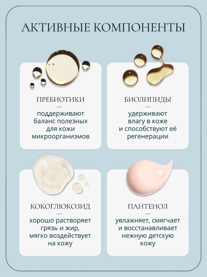 Мягкая бессульфатная формула крем-геля подходит даже для самой чувствительной кожи, деликатно очищая кожу малыша и не нарушая гидро-липидный баланс. Пребиотики помогают коже ребенка формировать и сохранять микробиом, поддерживая ее защитный барьер. Пантенол способствует увлажнению, смягчению и восстановлению нежной детской кожи.