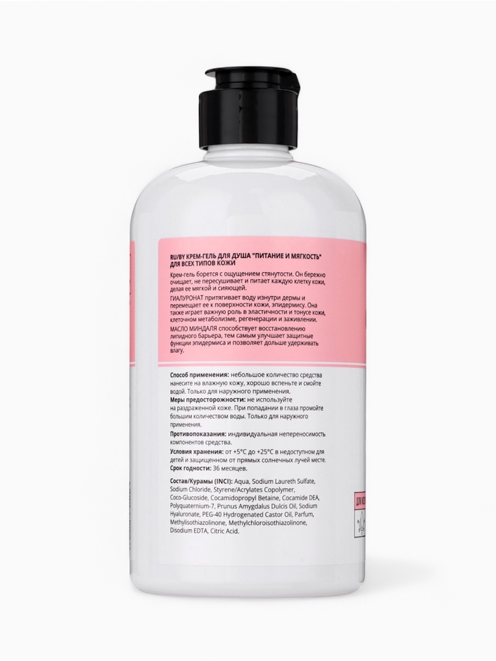 Aqua, Sodium Laureth Sulfate, Sodium Chloride, Styrene/Acrylates Copolymer, Coco-Glucoside, Cocamidopropyl Betaine, Cocamide DEA, Polyquaternium-7, Prunus Amygdalus Dulcis Oil, Sodium Hyaluronate, PEG-40 Hydrogenated Castor Oil, Parfum, Methylisothiazolinone, Methylchloroisothiazolinone, Disodium EDTA, Citric Acid.