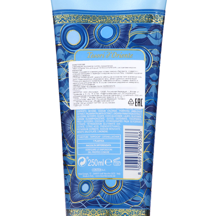 Tesori d'Oriente Гель для душа талассотерапия с экстрактами морских водорослей 500 мл приглашает Вас окунуться в мир эстетики и великолепия. Уникальная разработка итальянских парфюмеров создает гель для душа с ярким ароматом, обладающим хорошей стойкостью до 3 часов и уходовыми свойствами лосьона для тела. Гель для душа обеспечит бережное увлажнение и питание для вашей кожи, сделает тело гладким и шелковистым.