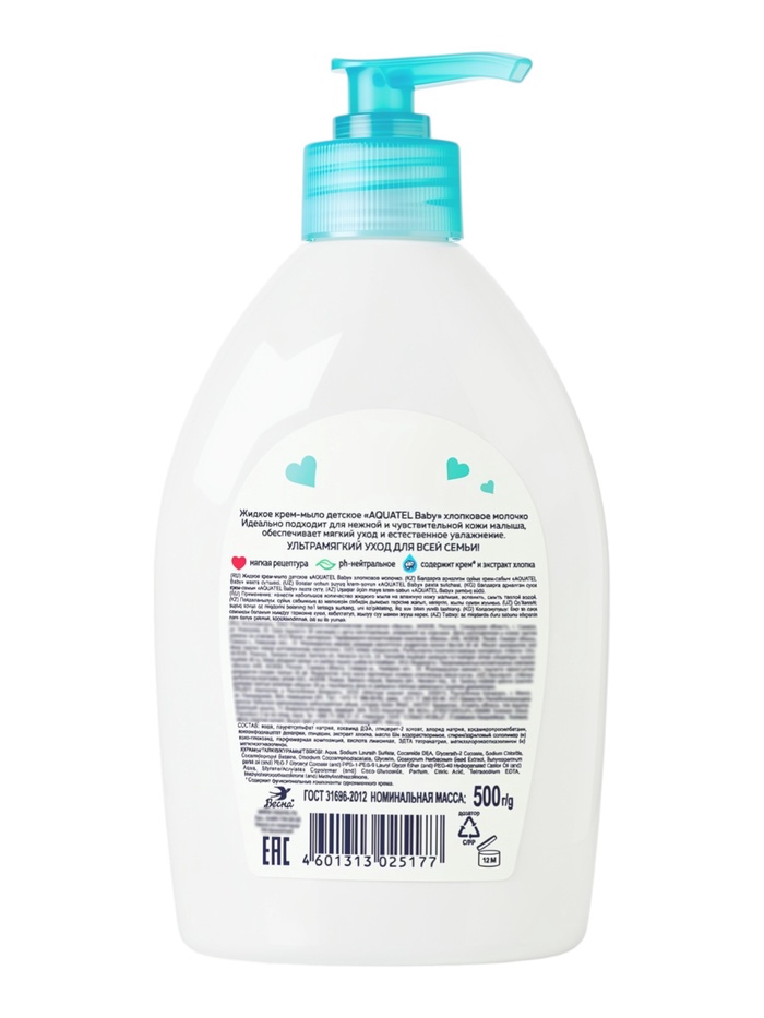 Крем-мыло жидкое «AQUATEL Baby» с хлопковым молочком — это мягкое средство для ежедневного ухода за нежной кожей малышей и всей семьи. Разработанное с учётом потребностей деликатной детской кожи, средство бережно очищает, не нарушая естественный гидролипидный баланс, и создаёт ощущение мягкости и комфорта после каждого применения.