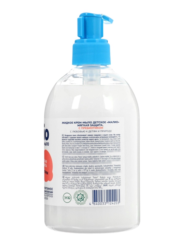 Удобная упаковка объёмом 500 мл с дозатором обеспечивает экономичный расход средства и простоту использования дома. Крем-мыло «Малио» мягкая защита с пребиотиком — это ежедневная забота о коже ребёнка, поддержка её естественного баланса, мягкость, увлажнение и комфорт при каждом купании.