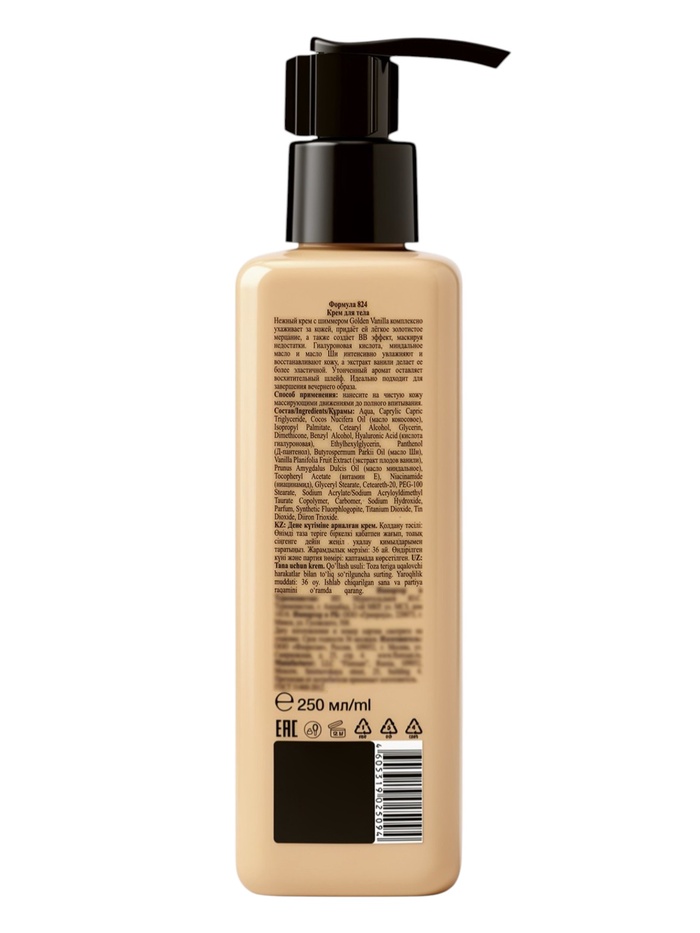 Aqua, Caprylic/Capric Triglyceride, Cocos Nucifera Oil (масло кокосовое), Isopropyl Palmitate, Cetearyl Alcohol, Glycerin, Dimethicone, Benzyl Alcohol, Hyaluronic Acid (кислота гиалуроновая), Ethylhexylglycerin, Panthenol (Д-пантенол), Butyrospermum Parkii Oil (масло ши), Vanilla Planifolia Fruit Extract (экстракт плодов ванили), Prunus Amygdalus Dulcis Oil (масло миндальное), Tocopheryl Acetate (витамин Е), Niacinamide (ниацинамид), Glyceryl Stearate, Ceteareth-20, PEG-100 Stearate, Sodium Acrylate/Sodium Acryloyldimethyl Taurate Copolymer, Carbomer, Sodium Hydroxide, Parfum, Synthetic Fluorphlogopite, Titanium Dioxide, Tin Dioxide, Diiron Trioxide.