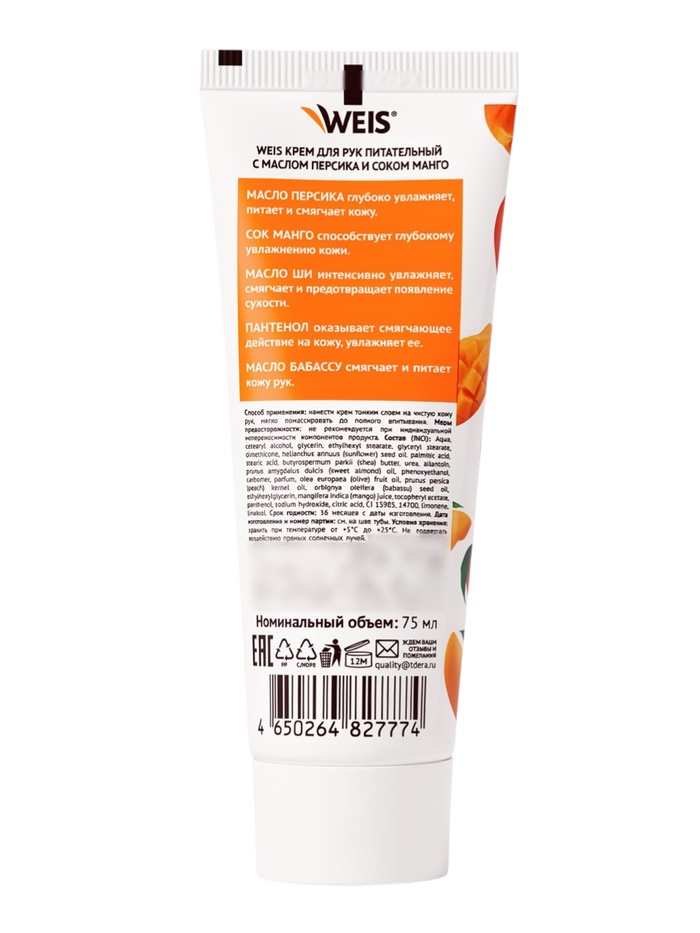 Крем питательный для рук WEIS, с маслом персика и соком манго, 75 мл