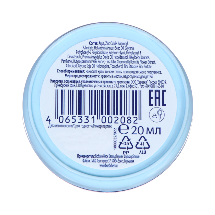 Состав: Aqua, Zinc Oxide, Isopropyl Palmitate, Helianthus Annuus Seed Oil, Glycerin, Polyglyceryl-3 Polyricinoleate, Butylene Glycol, Polyglyceryl-3 Diisostearate, Prunus Amygdalus Dulcis Oil, Hexyldecanol, Hexyldecyl Laurate, Panthenol, Butyrospermum Parkii Butter, Cera Alba, Chamomilla Recutita Flower Extract, Citric Acid, Glycine Soja Oil, Heliotropine, Tocopherol, Zinc Stearate, Zinc Sulfate