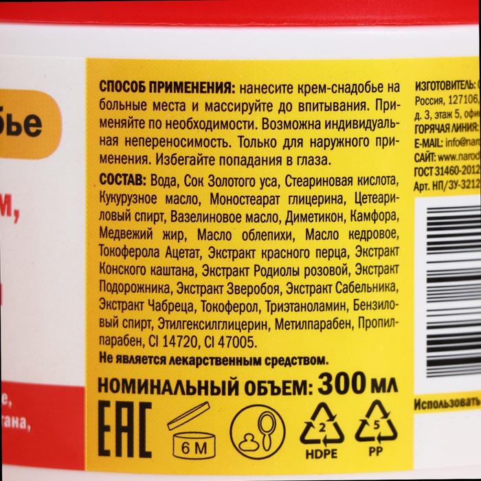 Состав: Вода, Сок Золотого уса, Стеариновая кислота, Кукурузное масло, Моностеарат глицерина, Цетеариловый спирт, Вазелиновое масло, Диметикон, Камфора, Медвежий жир, Барсучий жир, Масло облепихи, Масло кедровое, Экстракт красного перца, ВСЭ Конского каштана, ВСЭ Родиолы розовой, ВСЭ Подорожника, ВСЭ Зверобоя, ВСЭ Сабельника, ВСЭ Чабреца, Токоферол, Триэтаноламин, Бензиловый спирт, Этилгексилглицерин, Метилпарабен, Пропилпарабен, CI 14720, CI 47005.
