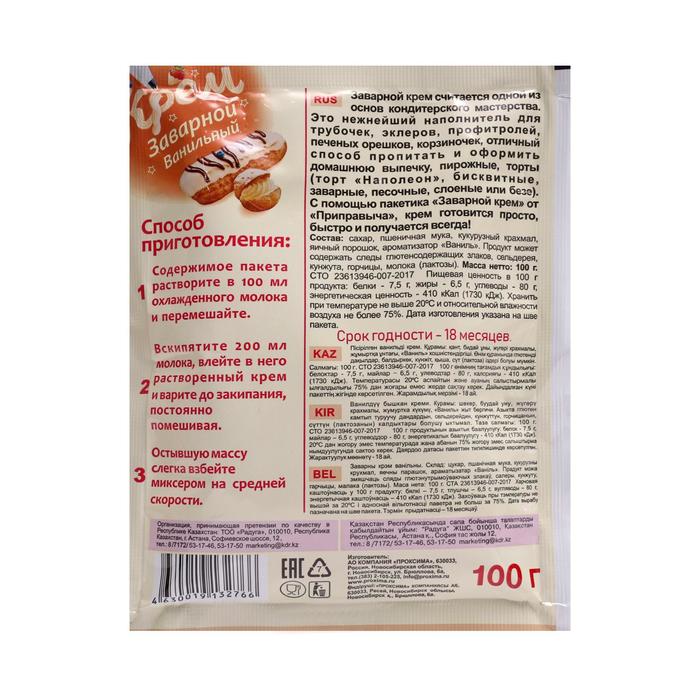 Заварной крем считается одной из основ кондитерского мастерства. Это нежнейший наполнитель для трубочек, эклеров, профитролей, печеных орешков, корзиночек, отличный способ пропитать и оформить домашнюю выпечку, пирожные, торты (торт «Наполеон», бисквитные, заварные, песочные, слоеные или безе). С помощью пакетика «Заварной крем» от «Приправыча», крем готовится просто, быстро и получается всегда!