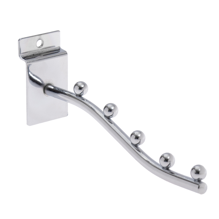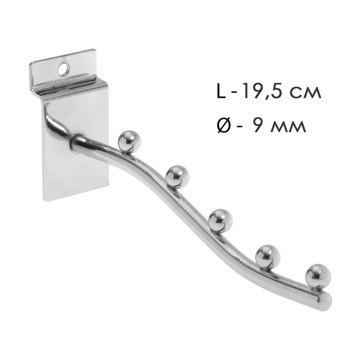 Кронштейн для экономпанелей, изогнутый, с 5 шариками (d=9 мм, L=19,5 см, цвет хром) — это надежное и удобное решение для крепления товаров на экономпанелях. Изогнутая форма и шариковые окончания позволяют надежно фиксировать товары, такие как аксессуары, упаковки, мелкие изделия или одежду, обеспечивая их стабильное размещение и удобный доступ для покупателей.